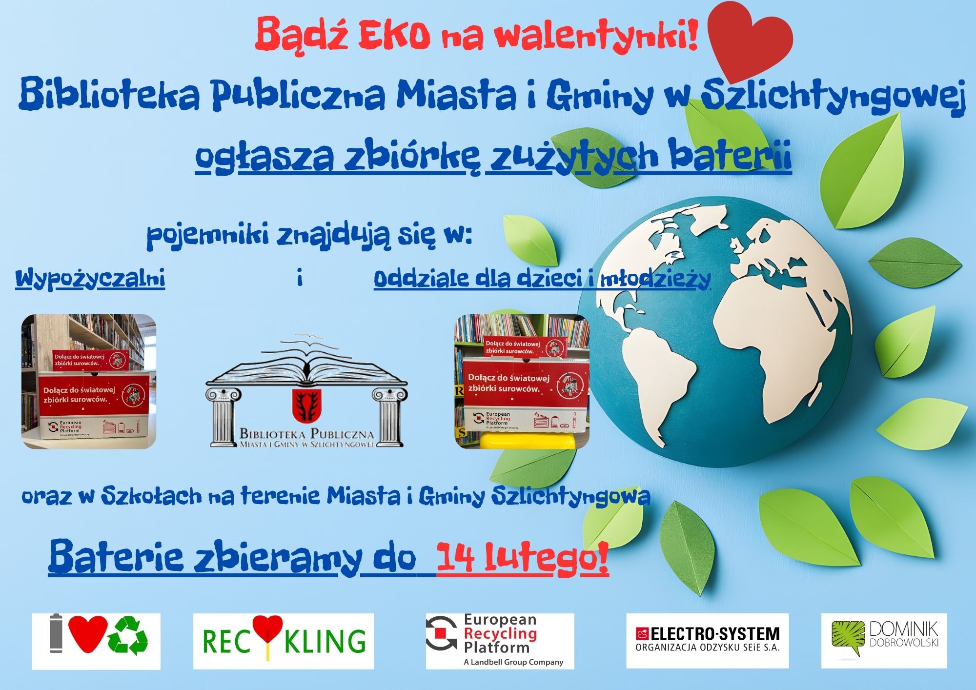 Biblioteka Publiczna Miasta i Gminy w Szlichtyngowej zaprasza do udziału w ekologicznej akcji walentynkowej. Bądź EKO na walentynki! W trosce o środowisko organizujemy zbiórkę zużytych baterii.